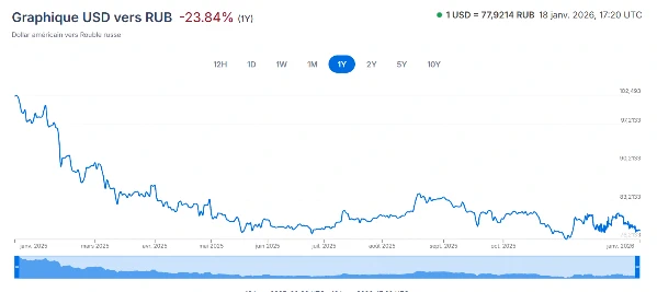 En 2025, le dollar a perdu 24 % de sa valeur face au rouble russe. Pour prendre la mesure de cette chute, il suffit de comparer : en janvier 2025, 1 dollar valait 102 roubles ; en décembre de la même année, il n’en valait plus que 76. Une baisse de cette ampleur n’est pas anodine. Elle reflète une tendance plus large : le dollar s’affaiblit face à plusieurs devises majeures.