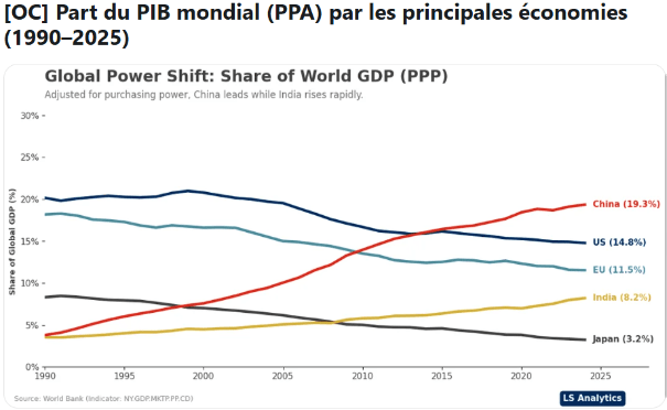 Part du PIB mondial (1990-2025) Source : World Bank, LS Analytics